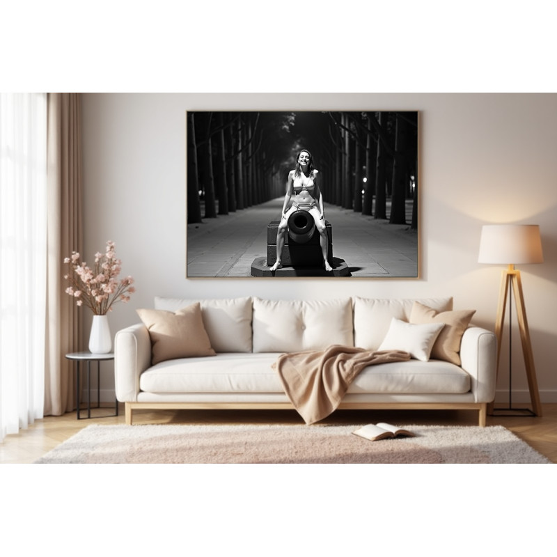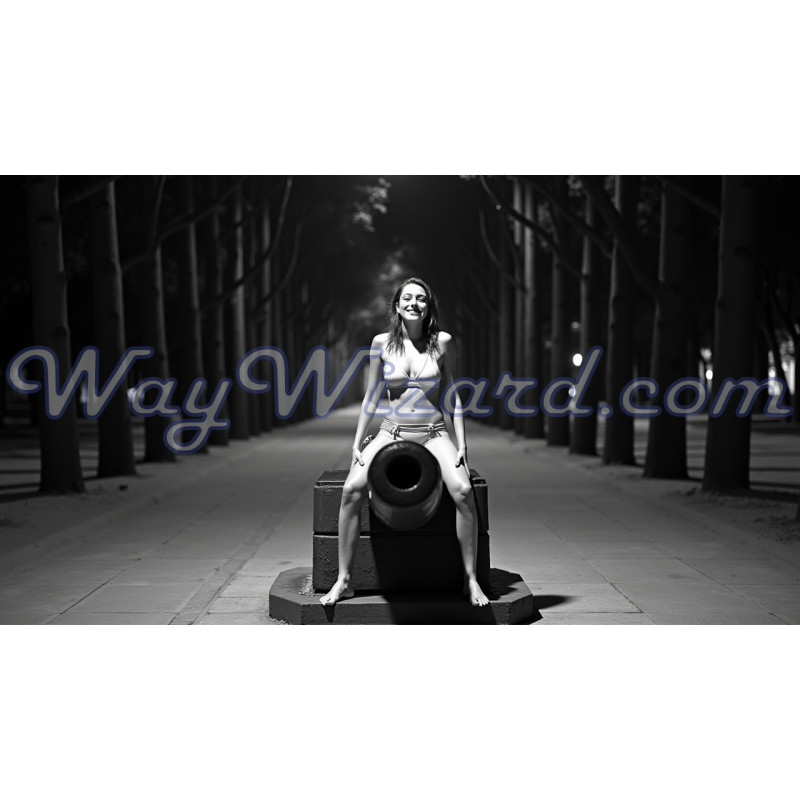 Фотореалістична чорно-біла картина, що передає атмосферу нічного усамітнення та легкої грайливості. Молода жінка, одягнена лише в шорти, сидить верхи на масивній гарматі артилерійської в парку.