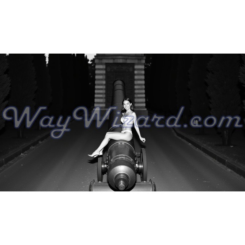 Естетична фотореалістична картина, виконана в чорно-білих тонах. На зображенні — молода жінка, яка близько 25 років сидить на масивній вінтажній гарматі на колісному лафеті із залізними колесами.
