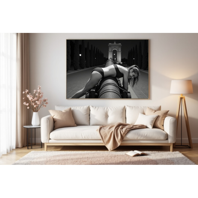 Фотореалістичний чорно-білий малюнок з дівчиною біля гармати в провокаційну позу. Світло ліхтарів, арка та похмурий парк – потужний візуальний акцент.