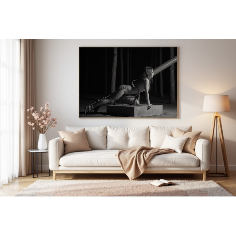 Фон – темний ліс з високими деревами та розсіяним світлом – посилює драматичне відчуття ізоляції та сили. Картина надрукована на полотні та підійде для арт-інтер'єрів, студій чи колекцій сучасного ню-мистецтва.