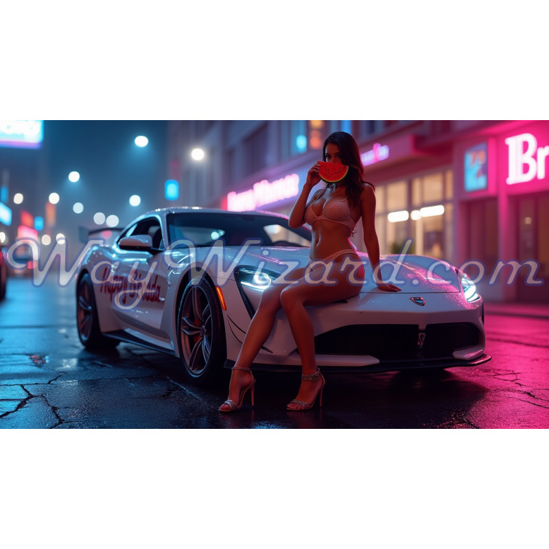 Міська ніч, спорткар та загадкова дівчина з часточкою кавуна – фрагмент літньої спокуси у світі неонових вогнів.