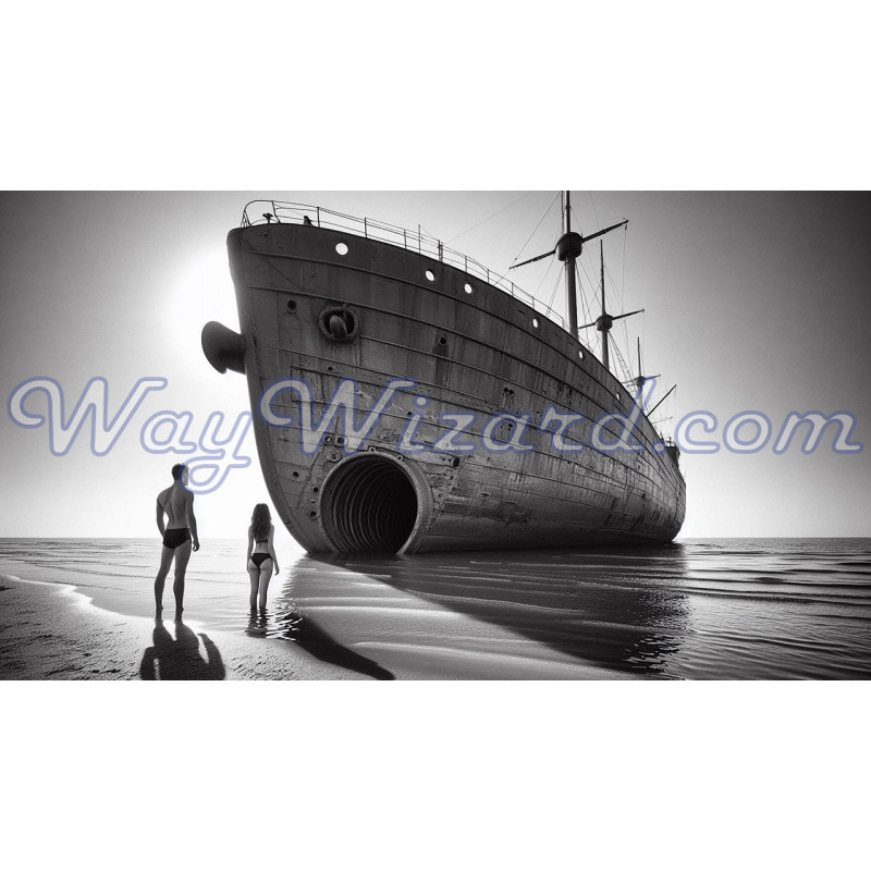 Картина Примари минулого — це не просто знімок, а портал до іншого часу. Напівзатоплений корабель, що вріс у пісок, стає монументом людським амбіціям, а дві фігури перед ним — наче останні хранителі його таємниць.