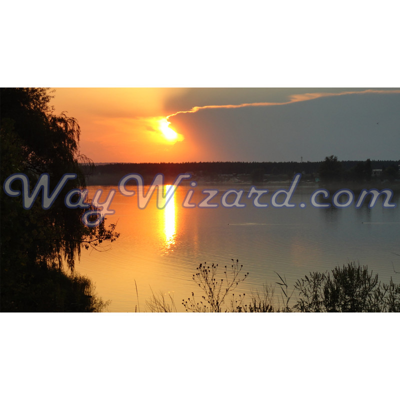 Картина «Захід над озером» — теплий вечірній пейзаж із віддзеркаленням сонця