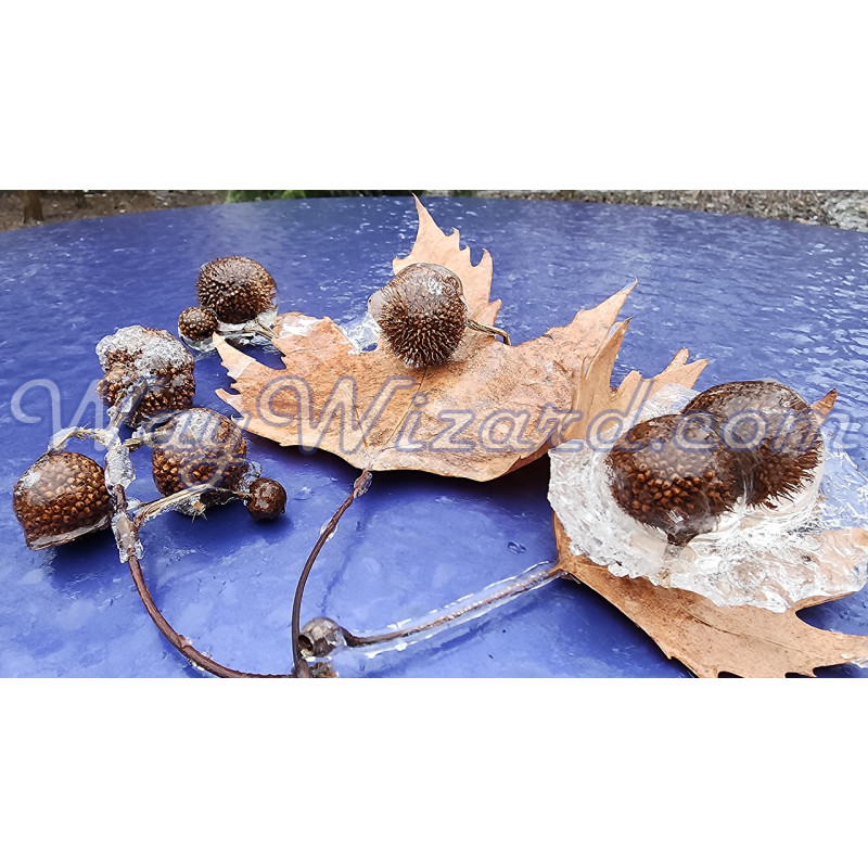 Фотокартина з плодами платана та осіннім листям, вкритими прозорим льодом. Контраст холоду і природної фактури.
