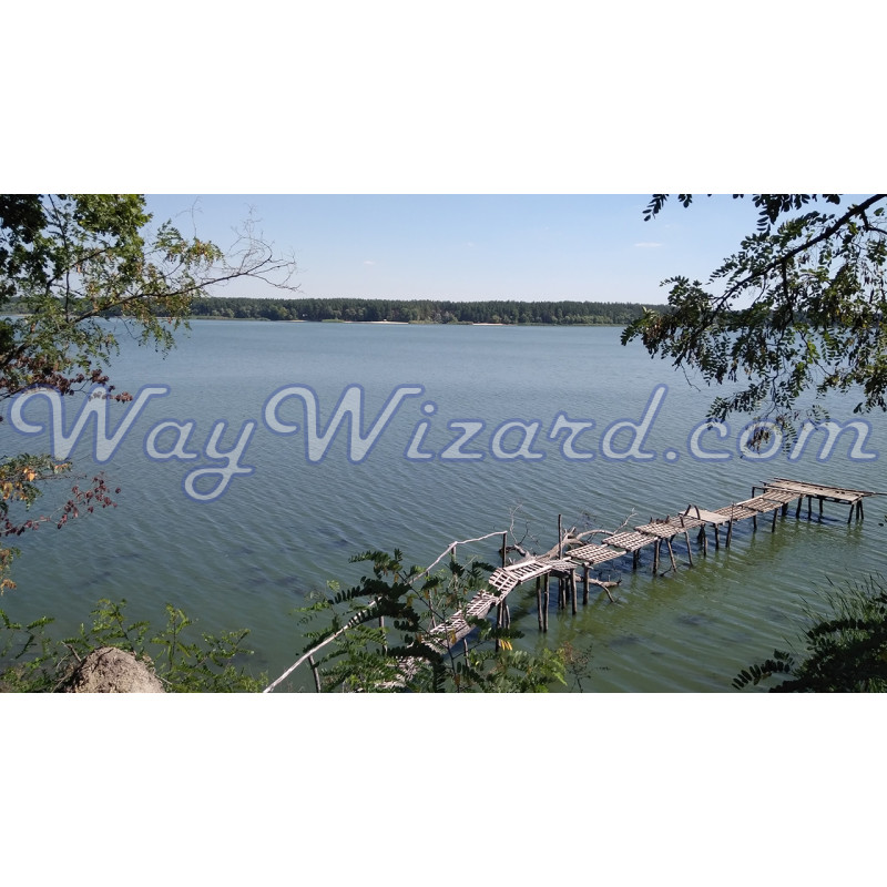Фотокартина з озером і старим дерев’яним пірсом у прозорій воді. Спокій, простір і жива природа.