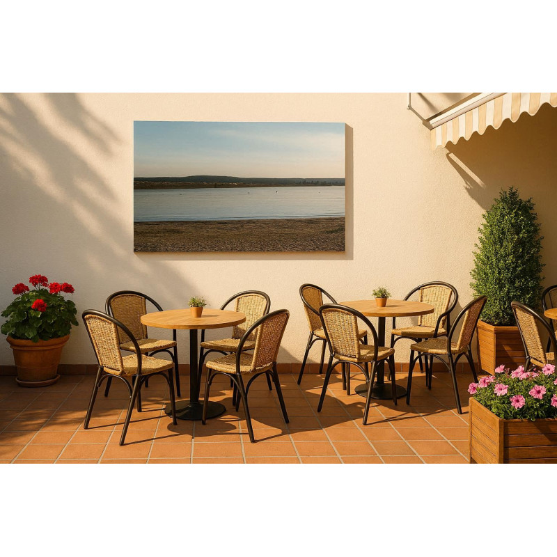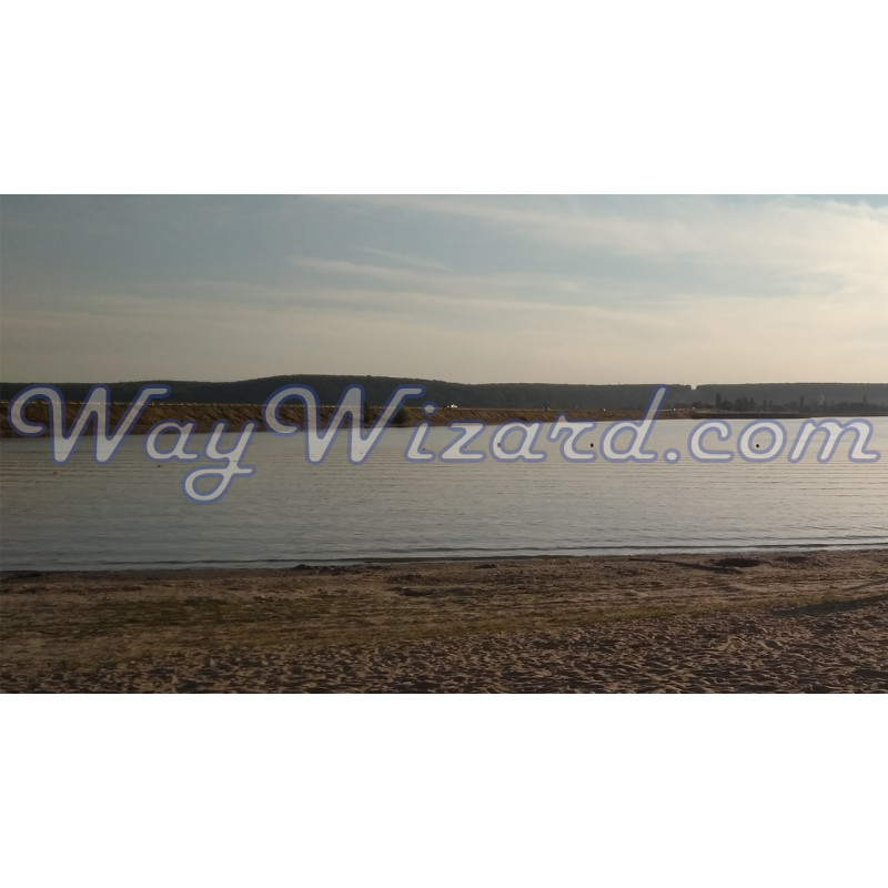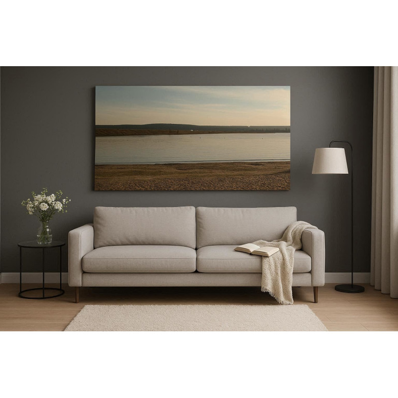 На фотографії — спокійна водойма з піщаним берегом і протяжною лінією дамби на обрії. М’яке світло й тиша простору створюють відчуття зупиненого часу та внутрішнього спокою.
